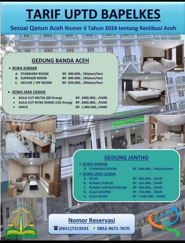 Banda Aceh – Pemerintah Aceh melalui UPTD Bapelkes resmi menetapkan tarif layanan akomodasi dan jasa usaha sebagai bagian dari implementasi Qanun Aceh Nomor 4 Tahun 2024 tentang Retribusi Aceh. Penetapan tarif ini mencakup fasilitas penginapan, ruang pertemuan, hingga layanan transportasi yang dapat dimanfaatkan oleh masyarakat maupun instansi.